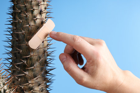 Finger of hand approaches the spines of cactus, which are protection with medical band-aid. Health protection concept and medical services and goods