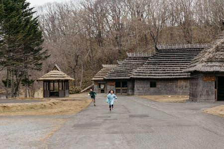 Children running in area of Shiraoi Ainu Village Museum in Hokkaido, Japan.