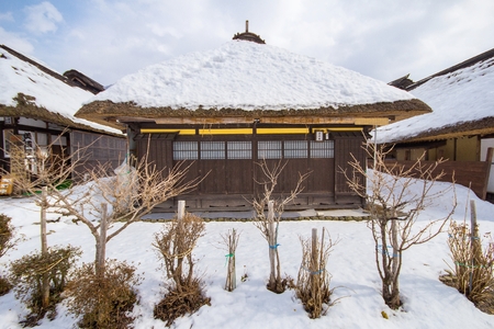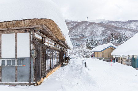 FUKUSHIMA, Japan - DEc 29, 2017: Winter Ouchijuku village is a fomer post town along the Aizu-Nishi Kaido trade route, which connected Aizu with Nikko during the Edo period