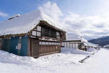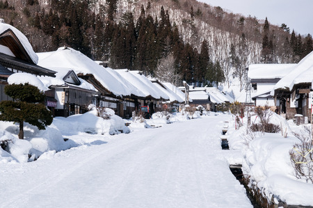 FUKUSHIMA, Japan - Feb 2, 2018: Winter Ouchijuku village is a fomer post town along the Aizu-Nishi Kaido trade route, which connected Aizu with Nikko during the Edo period