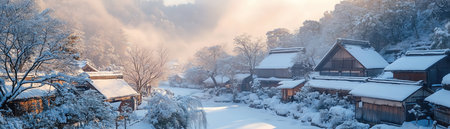 Historic Villages of Shirakawa-go, Japan in snowy day, film tone, classic look.