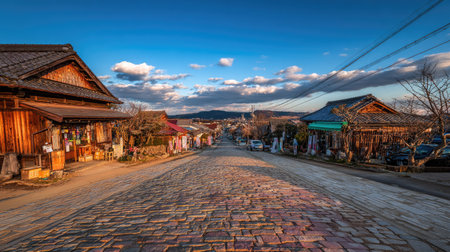 Explore a picturesque traditional village with a stone pathway surrounded by vibrant autumn foliage, showcasing a harmonious blend of rustic architecture and nature.