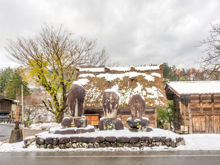 Three respect faithfull stones along local road in Shirakawa village, Gifu, Japan, with Gassho-zukuri architecture house in early winter season with melting snow