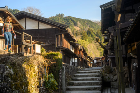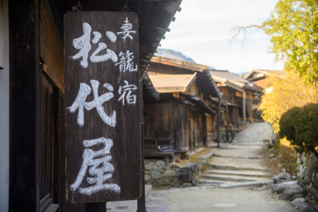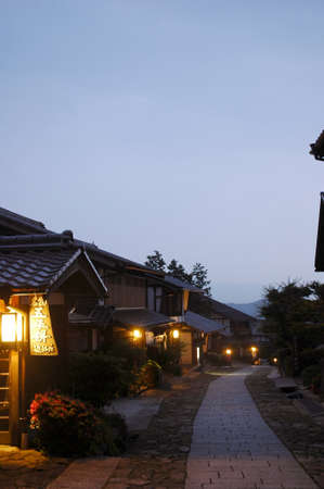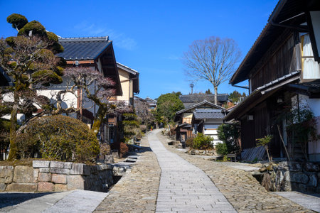 Narai-juku preserved historic post town and old houses near temple, Kiso valley, Shiojiri, Nagaano, Japan. Famous travel destination or landmark in Chubu.