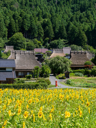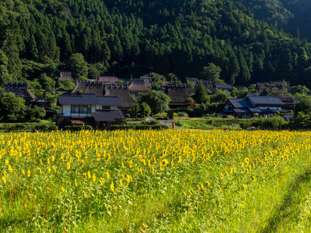 Sunflower fields in full bloom and Miyama Kayabuki Village