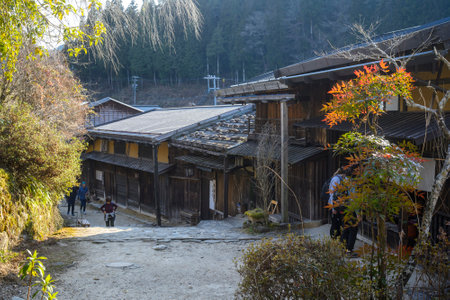 Magome, Japan - June 30, 2015: Japanese tourists visit a restaurant housed in restored wooden buildings on a traditional stone path on the ancient Magome-Tsumago portion of Nakasendo trail.