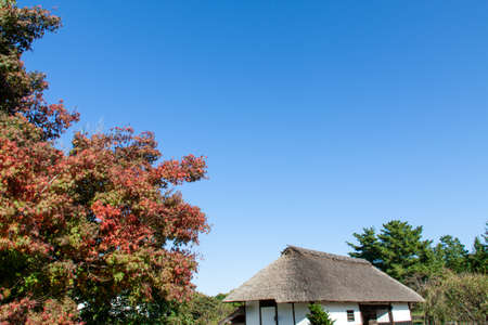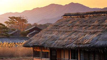 Traditional Thatched Roof on Rustic Cottage at Sunset with Mountain Views and Autumn Foliage in Japanese Countryside.