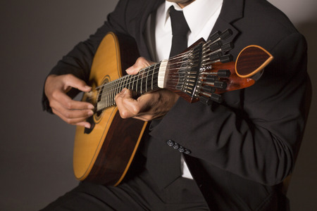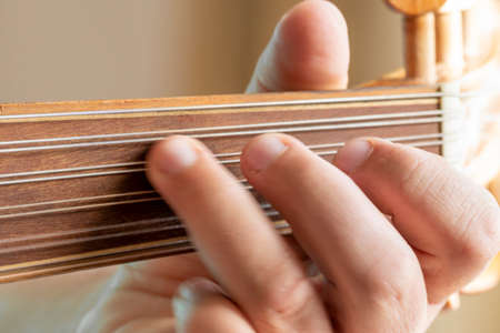 Close up shot of a man with his fingers on the frets of a portuguese guitar playing