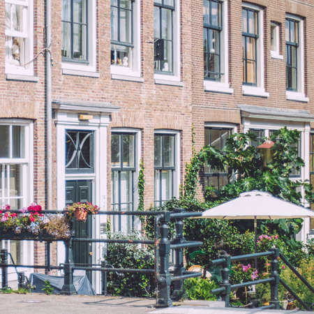 Delft, Netherlands - August 3, 2016: Cityscape of Delft with picturesque buildings, bridge, canals and cobble pavement