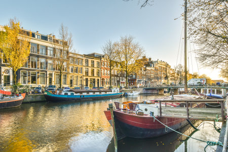 Tree-lined canal with brick buildings, moored boats and cloudy sky in Amsterdam. Famous for its huge cultural activity, graceful canals and bridges.