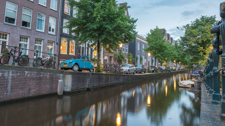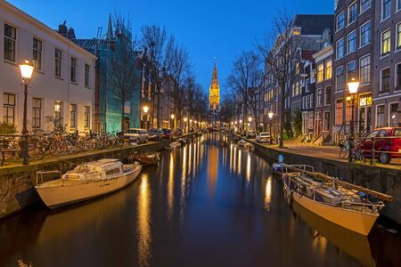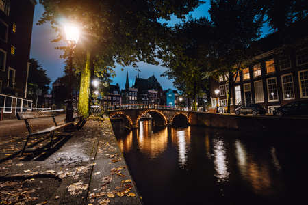 City Canal with glowing lights early in the morning. Amsterdam. Netherlands.