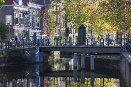 Delft, The Netherlands - October 10, 2019: There is a bridge that connects the two banks of the canal. There are trees around and also bicycles parked along the canal.