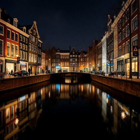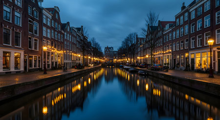 Water is reflecting warm city lights as it flows on a canal in amsterdam, netherlands at dusk