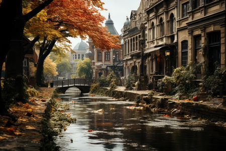 Autumn city rainy landscape, orange golden foliage, fall wallpaper, AI Generated illustration