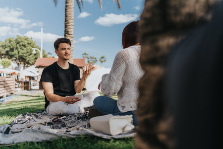 Group of friends enjoying a picnic together in a serene outdoor setting