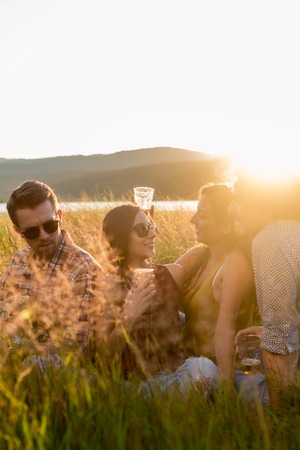 Friends enjoying evening mood of summer day sitting in high grass with drinks and guitar music