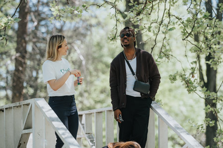 Carefree friends enjoying a sunny day at an urban park, personifying a modern city lifestyle