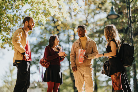 Friends gather in the park enjoying snacks and conversation on a sunny day