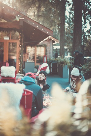Groups relaxing with warm beverages outside contemporary winter cafe.