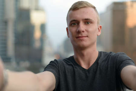 Portrait of young man taking a selfie while out on the city street, close up