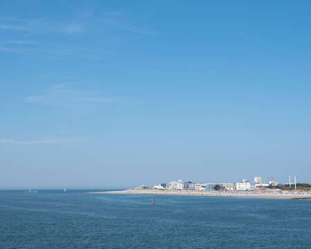 town and beach of german island norderney seen from ferry to mainland on sunny summer day