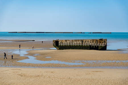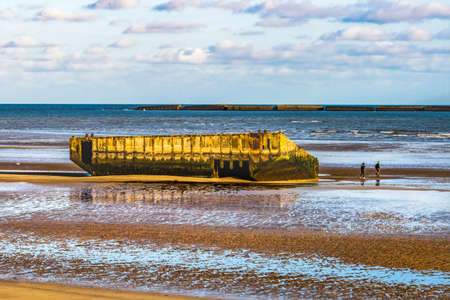 Old Ramp Beach World War 2 Mulberry Harbor Artificial Port Arromanches-les-Bains Normandy France. Through Beach and Ramp 104,000 tons miltiary supplies in six days