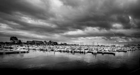 SAINT VAAST, FRANCE - SEPTEMBER Circa, 2020. Dramatic cloudy Sky landscape on the harbor with sailboats. Panorama, dark pessimist atmosphere feelings. Desaturated image