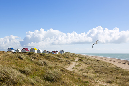 Small cabins in the dunes at the beach of Gouville-sur-Mer, Normandy, France