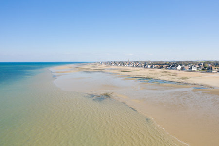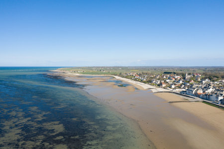 A wide aerial view captures the sandy coast and tidal flats of Grandcamp-Maisy, with the village stretching along the edge of the beach under a clear blue sky. The open landscape and calm sea create a serene, spacious atmosphere.