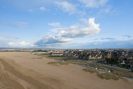Landscape view of a sandy beach along the North Sea on the east coast of Scotland, next to St. Andrews, with unidentifiable people.
