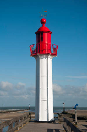 Red lighthouse with wooden pier with blue sky with rainy clouds background in the Normandia, France.