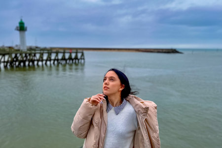 Portrait of a beautiful young woman in a winter jacket standing on a wooden pier in front of the rainy clouds on the background in the Normandy, France.