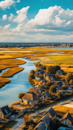 The landscape showcases Gurande's stunning salt marshes, where winding canals meander through golden fields, with charming thatched-roof houses nestled in the idyllic setting.