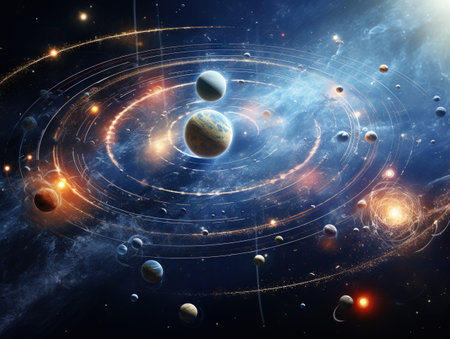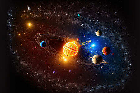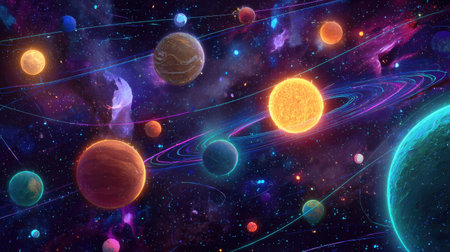 Vibrant cosmic scene illustrating planets gracefully orbiting a radiant sun amid a star-studded dark universe, blending artistic style with astronomic