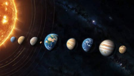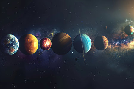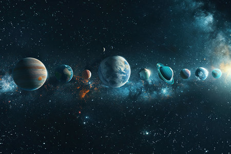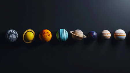 A mesmerizing depiction of the solar system featuring planets aligned against a dark backdrop, showcasing their unique colors and textures. Perfect for educational and artistic use.