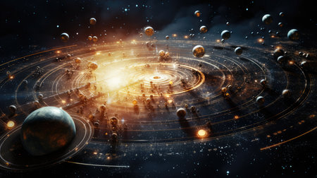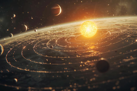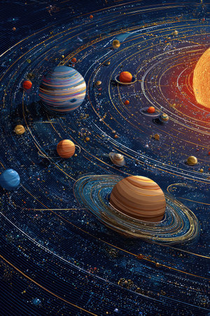 A stunning digital model of the solar system showcasing planets orbiting the sun. This vibrant depiction highlights the beauty of space and celestial dynamics.