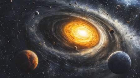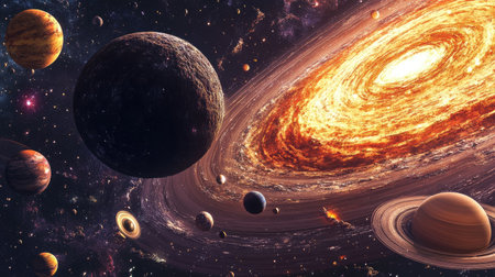 A vibrant digital illustration depicts a cosmic scene featuring multiple planets and celestial bodies within a swirling galaxy. The artwork showcases detailed planetary textures and warm light against a dark background. This image could be suitable for educational materials, science articles, or creative visual projects.