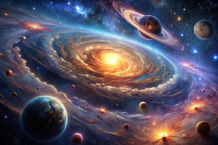 Stunning digital illustration of a vibrant galaxy surrounded by planets. This high-resolution artwork captures the beauty and mystery of space. Perfect for cosmic-themed projects.