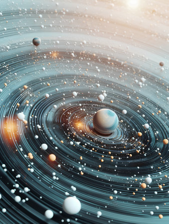 An abstract representation showcases floating spheres in various colors, dancing around an invisible center in a dark cosmic setting, evoking a sense of wonder.