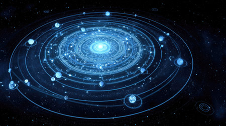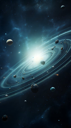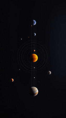 Explore this captivating abstract illustration of celestial bodies in an orbit around a central star, set against a dark cosmic backdrop.