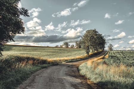 Landscape summer rural scene in France, region Burgundy. Road and nature in old europe. Countryside road in Burgundy.