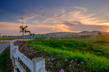 Wonderful Dairy Farm sunrise landscape with blooming Mexican petunia (Ruellia brittoniana) flowers, sunrise scenery, colorful scene, and beauty farm.