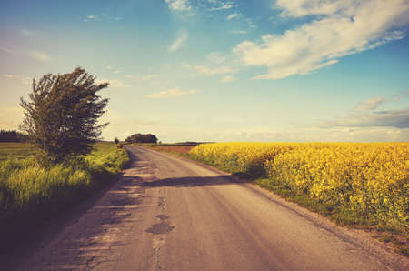 Road by a rapeseed field in blossom at sunset, color toning applied.