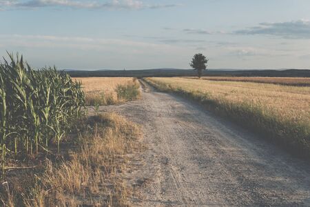 Asphalt road in the countryside. Yellow wheat field in july. Agricultural concept, landscape in highland, Vysocina Czech Republic