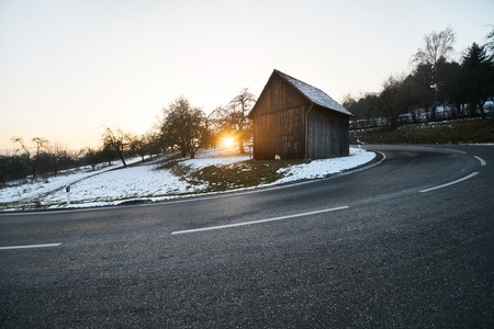 wooden cabin in sunset, winter with dark street in the front of view, snow