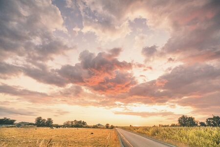 Rural sunset with an asphalt road crossing a countryside landscape with a farm and dry fields