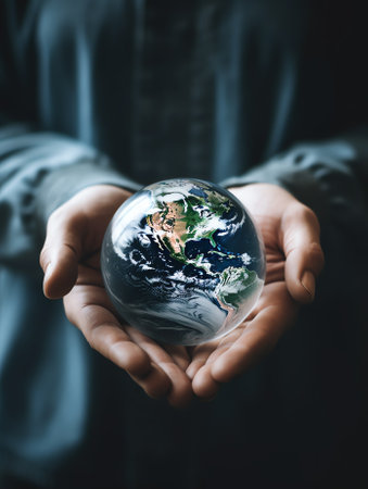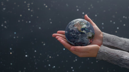 A hand cradles a miniature Earth globe, a vibrant sphere of blue and green, set against a dark backdrop. The composition features soft lighting, highlighting the world's continents and oceans. This image, with its conceptual symbolism, is suitable for various commercial uses related to global issues.