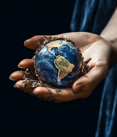 A close-up image of a miniature Earth globe partially submerged in sand, symbolizing the fragility of our planet and the need for care and responsibility towards its future.