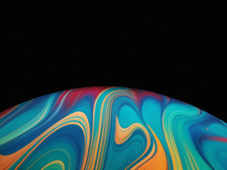 Close up picture of half soap bubble psychedelic color on black background look like colorful liquid planet in another galaxy