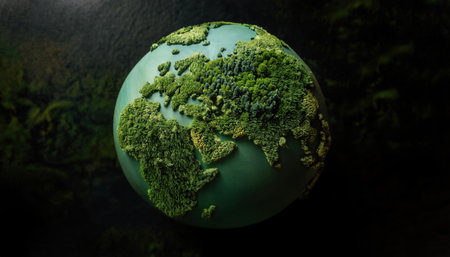 This globe representation showcases continents adorned with vibrant green foliage, creating a striking contrast against a dark backdrop, symbolizing nature's beauty and importance.